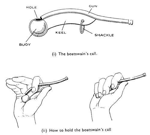 As ships were built larger, the silver whistle was worn by the Mates, and as the ships became larger still it was worn by the Boatswain's Mate, and still is in all the navies in the world. Although it has lost its designation as being the whistle of command and worn by the Commander, it is now recognised as the instrument by which the orders of the Commander are passed to the crew.