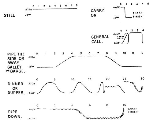 Many pipes, however, are orders in themselves and do not require any verbal addition afterwards; for instance, it is unnecessary to call "Hands to dinner" after the pipe "Dinner" even supposing you had enough breath left to do so after having made the pipe.